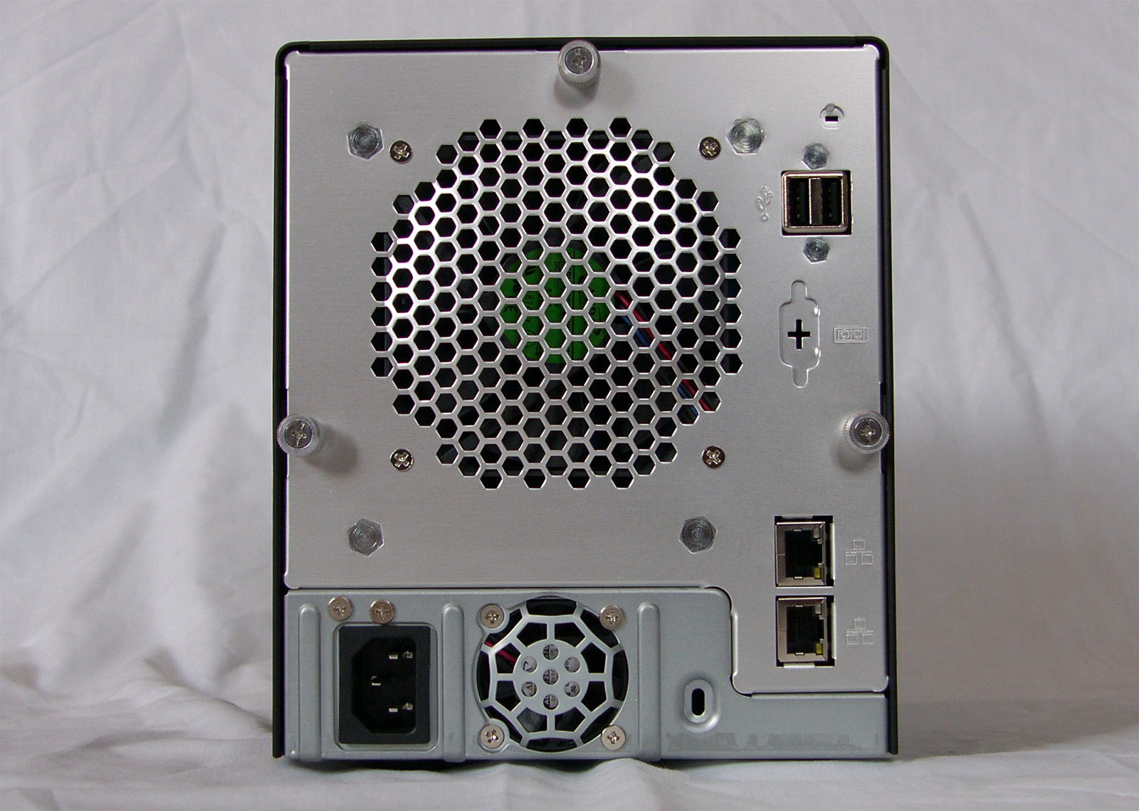 Den bakre sidan på N4100 Pro innehåller det man förväntar sig: nätverksuttag, USB-ingångar och baksidan på nätaggregatet. Utblås för 92-millimetersfläkten finns också. Thecus har som på tidigare enheter valt att ha två stycken nätverksuttag vilket ger lite fler möjligheter i exempelvis ett kontorsnätverk. Vill man ta bort sidorna och taket, kan man göra det med tre stycken tumskruvar.
