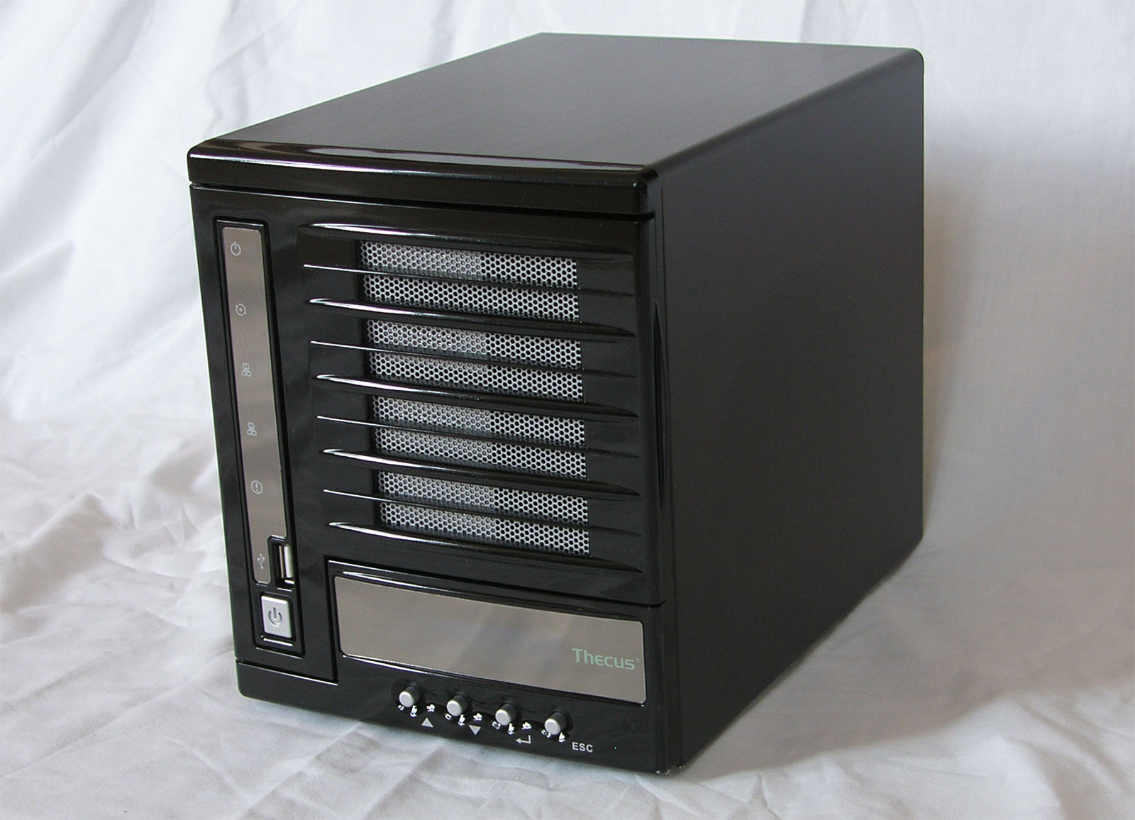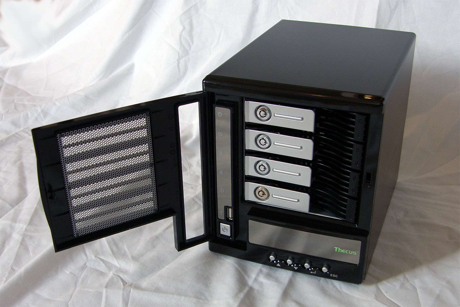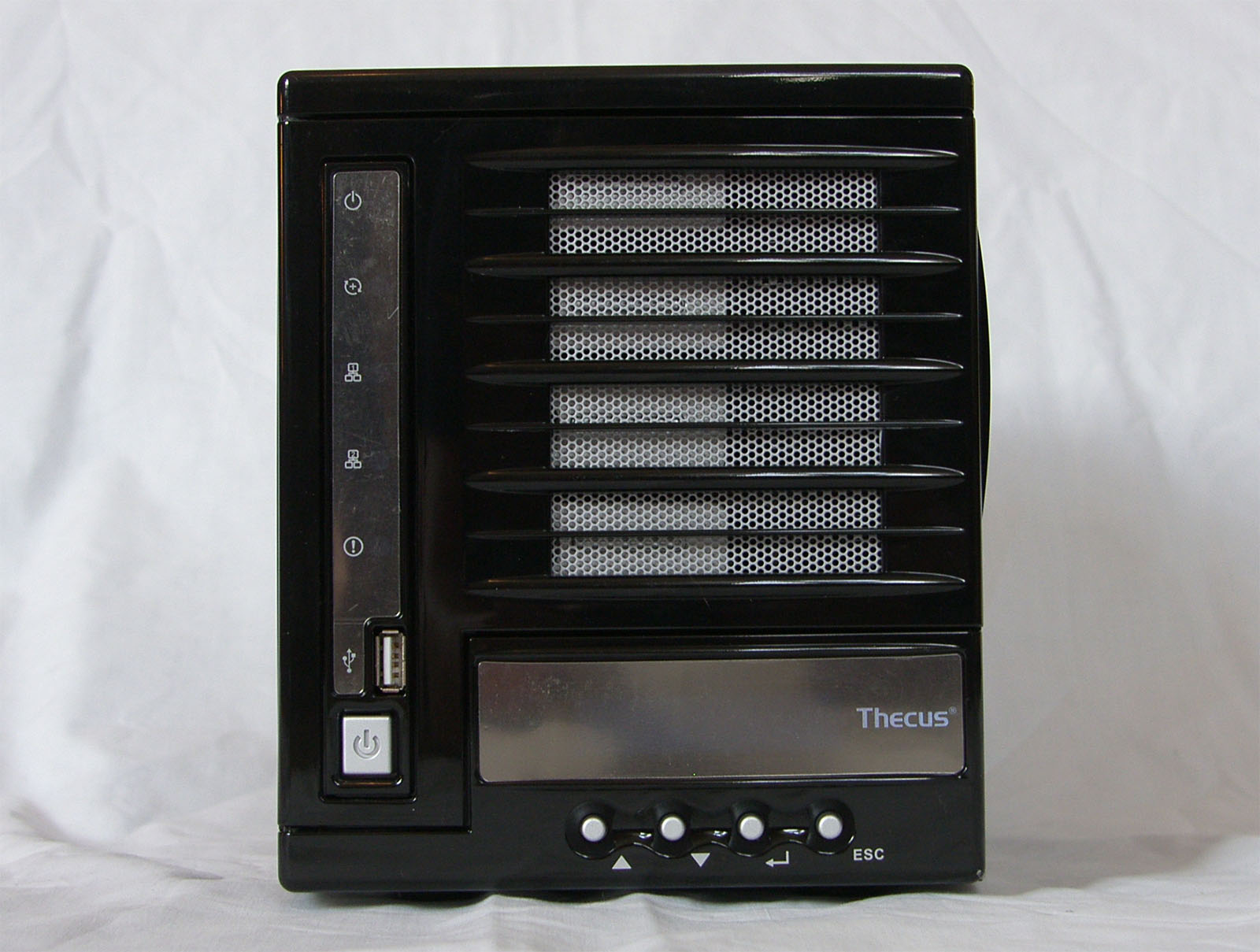 Thecus N4100 Pro är rätt lik den något större enheten [article id="6067"]N5200BR Pro[/article] som vi har recenserat tidigare. På denna enhet är hårddiskvaggorna gömda bakom en lucka. Framsidan innehåller förutom luckan även lysdioder som lyser när enheten har nätverkskontakt eller när den jobbar. Det finns även en liten LCD-display och ett par enklare navigationsknappar.