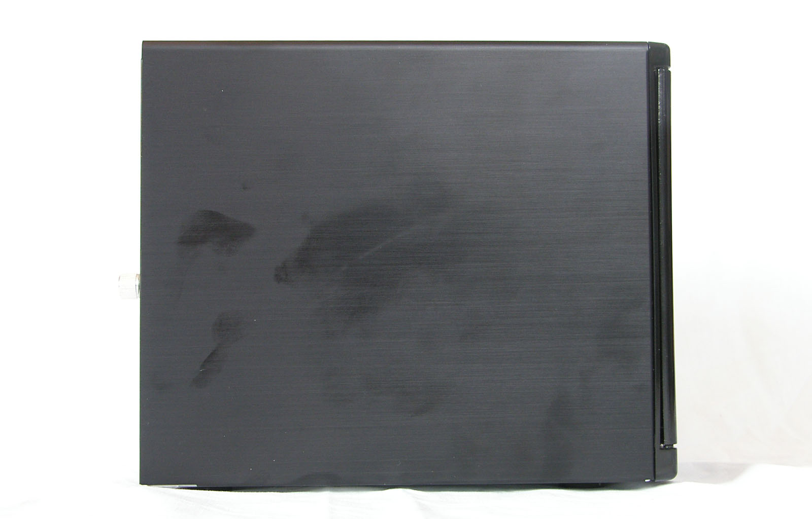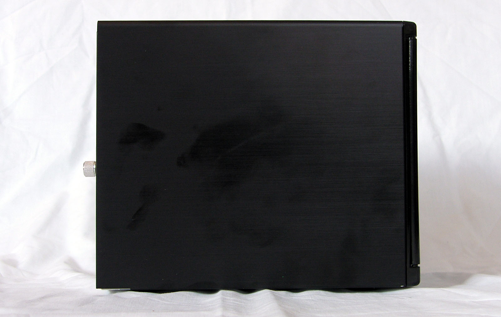 Vänstersidan på enheten. Den svarta borstade aluminiummaterialet får rätt lätt fettfläckar som kan ses på denna bild.