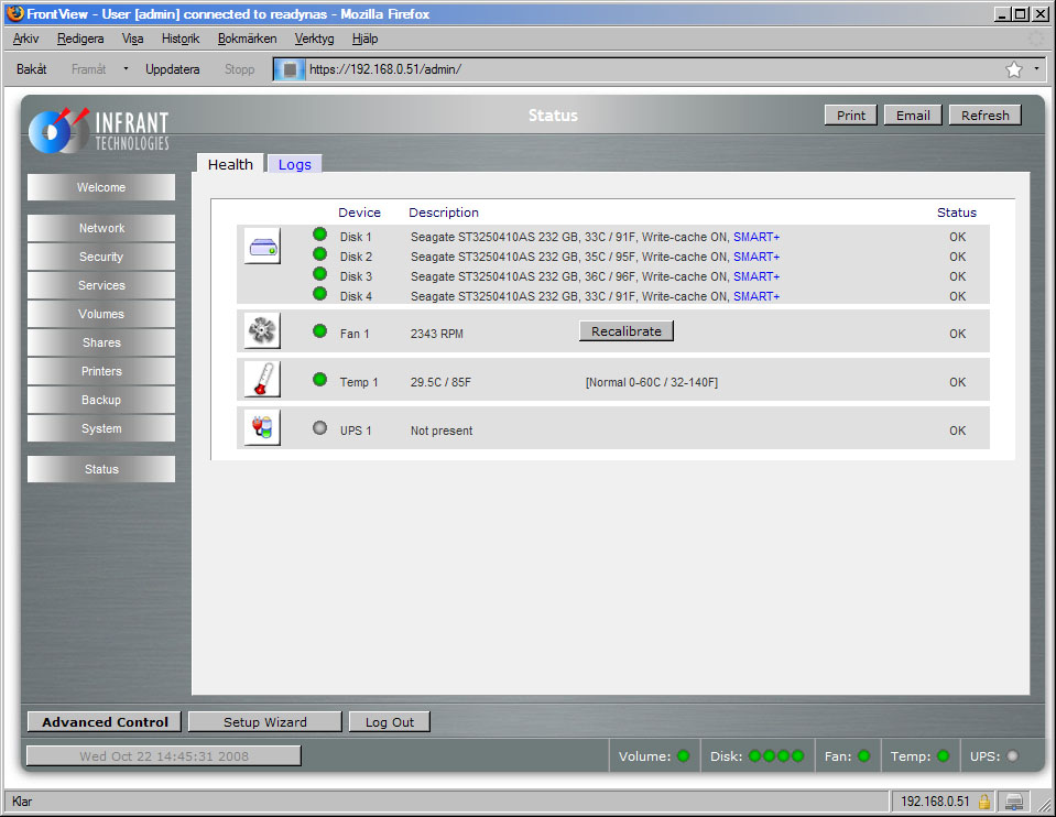 Ibland kan det vara smidigt att på ett enkelt sätt övervaka NAS-serverns välmående. Detta har Netgear tänkt på och gjort en hälsosida med lite generell information som kan vara smidig att hålla koll på.
