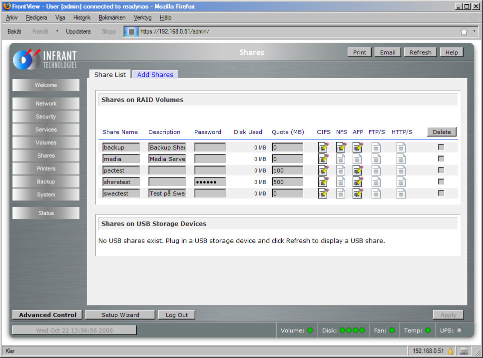 Att hantera utdelningar på ett smart sätt är viktigt på en NAS och här har Netgear tänkt till. Via utdelningskategorin kan vi se aktuella utdelningar samt lägga till egna. Det går att ställa in avancerade inställningar på denna sida, som till exempel via vilka protokoll som utdelningarna skall vara tillgängliga över. Detta har vi tidigare endast sett i lagringsspecifika Linux-distributioner som Openfiler.